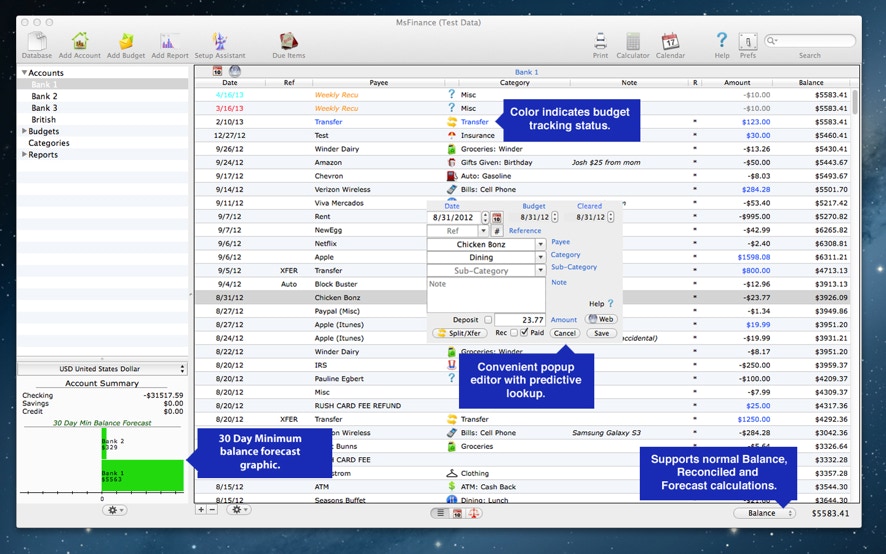 By providing support for transaction scheduling, MsFinance™ makes it convenient to track all your bills in one place. Easily determine which bills are paid and which ones need paying!